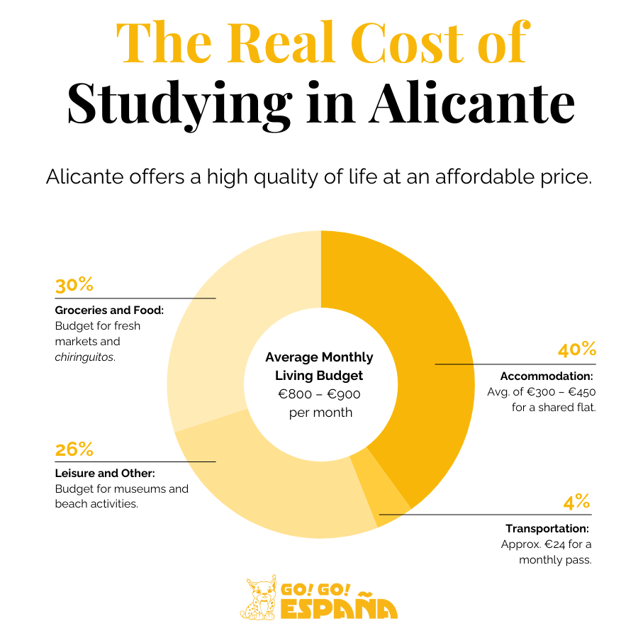 A data visualization infographic detailing the cost of living in Alicante for students, highlighting the affordable monthly budget of €800-€900.