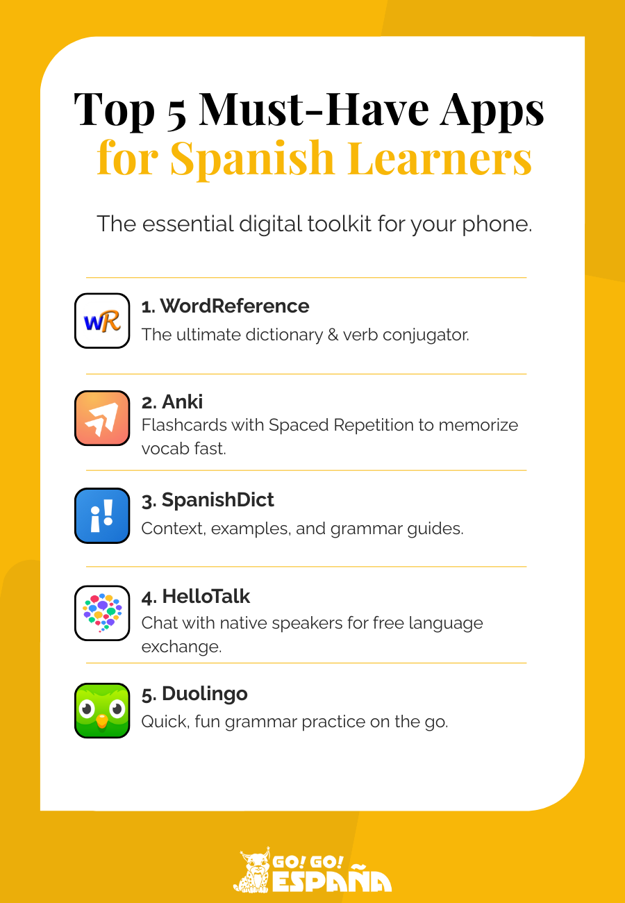 Think of this guide as your starter kit. The apps, TV shows, and podcasts help reinforce what you learn, improve listening, and connect you with Spanish culture.