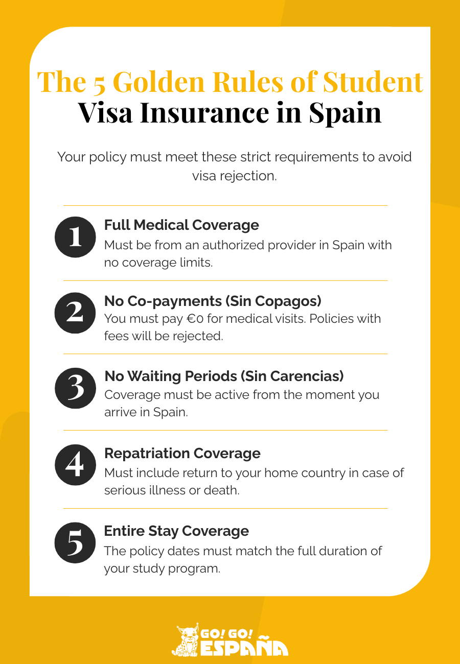 To be accepted for your health insurance for a Spanish student visa, your policy must meet five non-negotiable requirements.