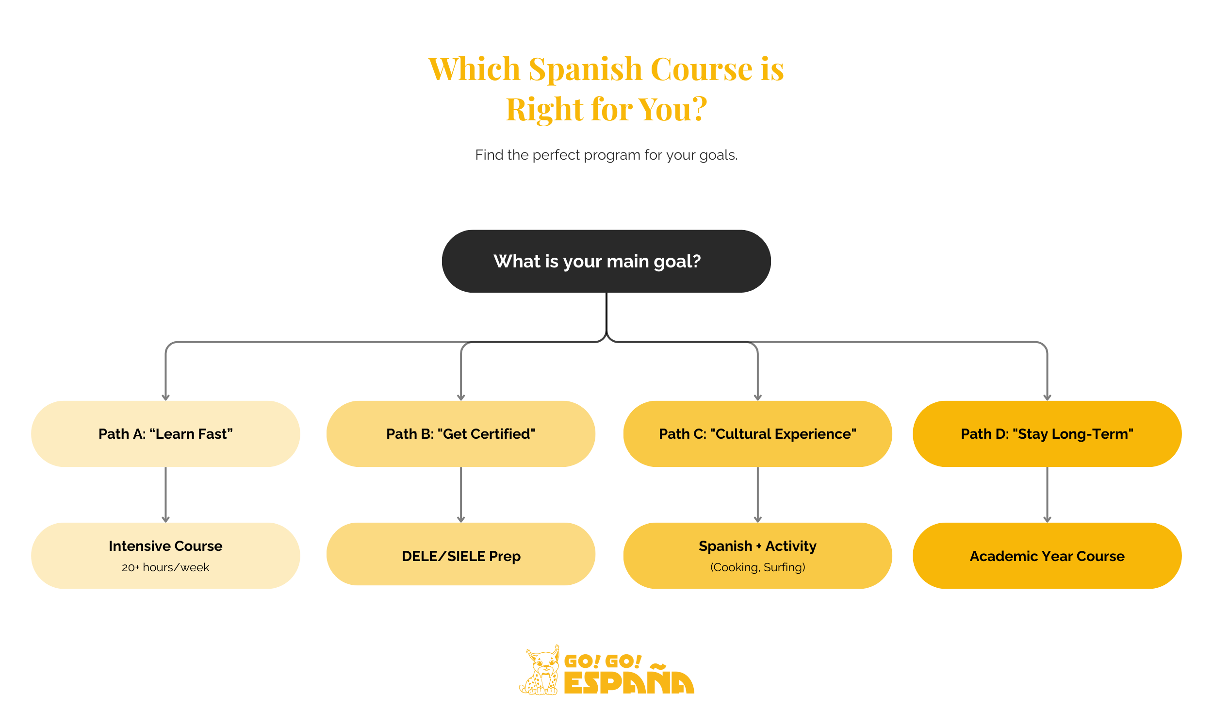 Flowchart guide to choosing the best Spanish courses in Spain based on student goals. (15 words)